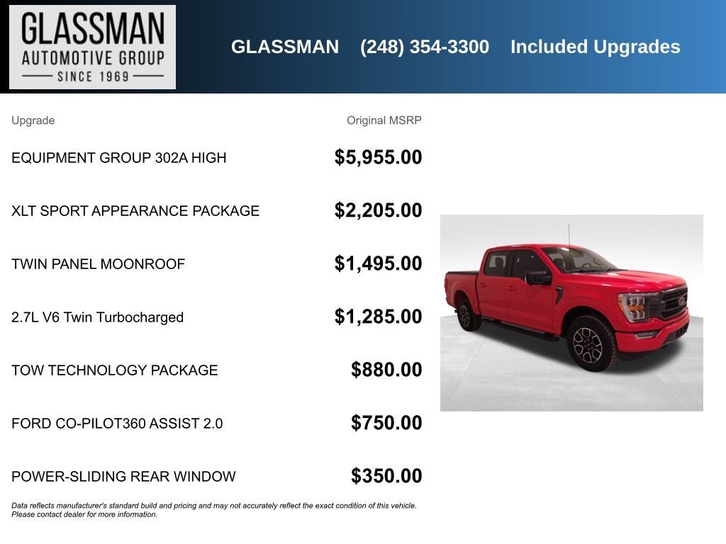 F-150 XLT, 4D SuperCrew, 2.7L V6 EcoBoost, 10-Speed Automatic, 4WD, Race Red, Black Cloth, 10-Way Power Driver & Passenger Seats, 360 Degree Camera, 8 Productivity Screen in Instrument Cluster, Class IV Trailer Hitch Receiver, Connected Built-In Navigation (DISC), Dual Zone Electronic Automatic Temperature Control, Equipment Group 302A High, Evasive Steering Assist, Ford Co-Pilot360 Assist 2.0 (DISC), Front fog lights, Fully automatic headlights, Heated Front Seats, Integrated Trailer Brake Controller, Intelligent Access w/Push Button Start, Intelligent Adaptive Cruise Control w/Stop & Go, Intersection Assist, Leather-Wrapped Steering Wheel, LED Reflector Headlamps, LED Sideview Mirror Spotlights, Onboard 400W Outlet, Power Glass Heated Sideview Mirrors, Pro Trailer Backup Assist, Rear Under-Seat Storage, Remote Start System w/Remote Tailgate Release, SYNC 4 w/Enhanced Voice Recognition, Tow Technology Package, Twin Panel Moonroof, XLT Chrome Appearance Package, Zone Lighting.