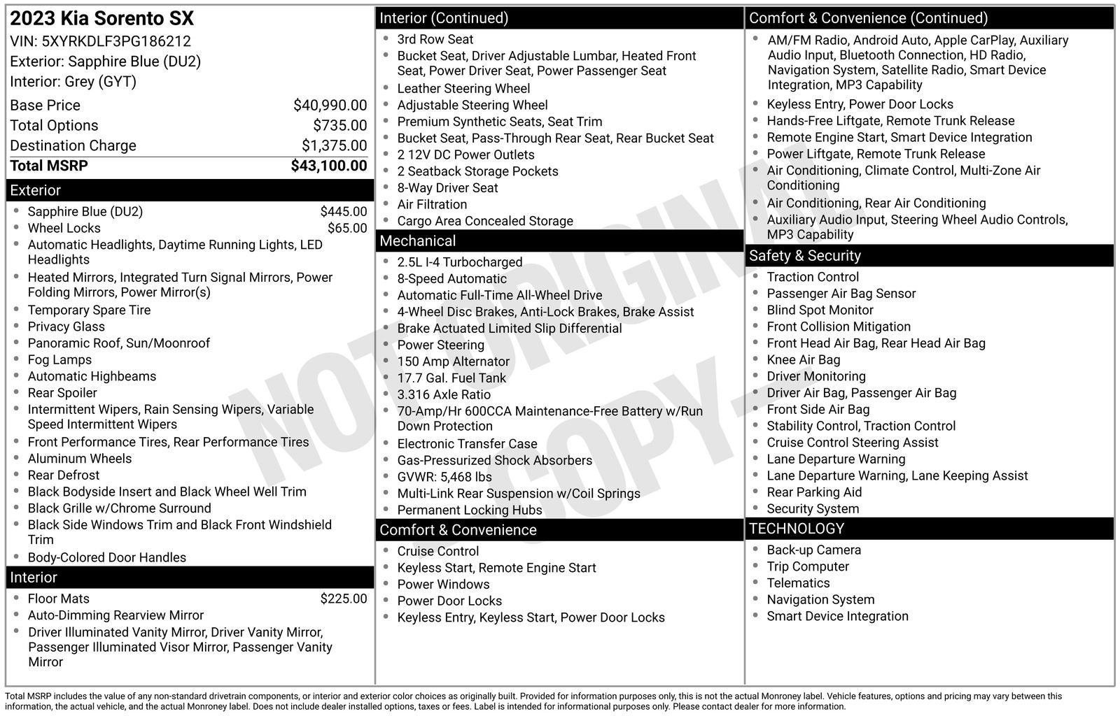 Carfax indicates only 1-Owner!!, Sorento SX, 4D Sport Utility, 2.5L I4 DGI Turbocharged DOHC 16V LEV3-ULEV70 281hp, 8-Speed DCT, AWD, Sapphire Blue, Grey Artificial Leather, Apple CarPlay & Android Auto, Auto-dimming Rear-View mirror, Exterior Parking Camera Rear, Fully automatic headlights, Navigation System, Power Liftgate, Power moonroof, Smart Key w/ Push Button and Remote Start. CARFAX One-Owner. Kia Certified Pre-Owned Details: